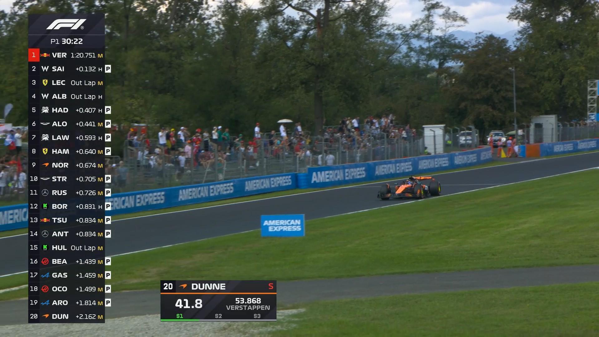 北京时间9月5日,在稍早结束的F1意大利大奖赛第一次练习赛中,汉密尔顿全场最快,勒克莱尔、塞恩斯位居二三。维斯塔潘第4,安东内利第5,诺里斯第6,阿尔本第7,拉塞尔第8,阿隆索第9,哈贾尔第10,邓恩第16,保罗-阿隆第20。